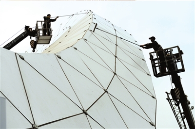 工人站在起重机吊臂上清洗园博园3号门的标志性建筑。京华时报记者蒲东峰摄