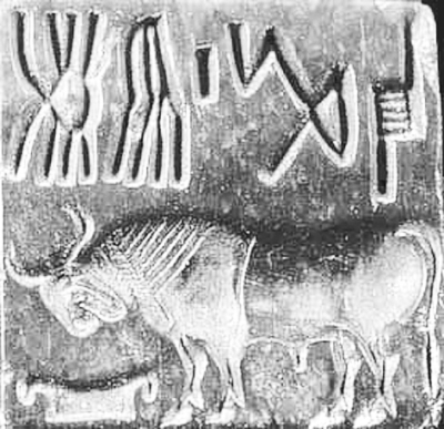 南亚次大陆最古老的文明是印度河流域文明,这一文明最早发现于哈拉帕(今巴基斯坦旁遮普省境内),因而也被称为哈拉帕文化。一般认为,哈拉帕文化存在的时间为公元前2300年至前1750年,印度的土著居民达罗毗荼人是这一文化的创造者。在哈拉帕文化遗址中,考古学家发现了印度最早的文字。这种文字多刻在石头、陶土或象牙制成的印章上,因此被称为印章文字。目前已出土的印章有2500多枚,印章正面刻着铭文,反面有穿孔的突出物,便于人们悬挂。据估计,印章上出现的文字符号约有500多个,但并未完全解读成功。印章上的铭文还有各种图案,题材多为当时印度常见的动物,如水牛、犀牛、短脚公牛、大象等。牛在哈拉帕人的生活中占有十分重要的地位,所以他们对牛的刻画也最为成功(见图)。有的印章表现了古代印度河流域人民狩猎、航行、娱乐等情景,还有的具有宗教神话含义。