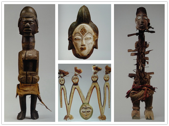 左:未填放灵力物质的男子雕像。 中上:普努族面具。中下:奎勒族带角面具。右:巫术偶像(即带钉子的法力偶像)。