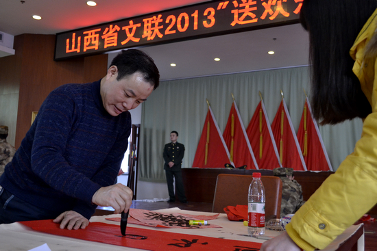 新春的脚步声清晰可闻,浓浓的年味儿扑面而来。2月6日(农历腊月二十六),由山西省政协常委、省文联党组书记、省书协副主席张根虎带队,山西省文联、山西大众书画院与山西省书法家协会、山西省美术家协会、山西省摄影家协会组成的“送欢乐下基层书画摄影进军营”慰问团一行30人,带着党和政府的温暖来到太原市国防教育训练中心进行慰问和文化服务,为这里的官兵们送上一份丰富的节日文化大餐,受到广大官兵的热烈欢迎。