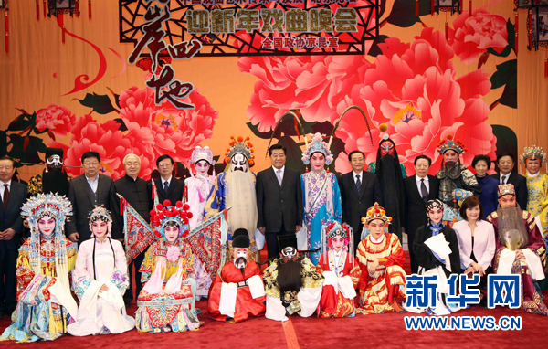 12月21日,“两岸四地中国戏曲艺术传承与发展·北京论坛”在北京全国政协礼堂举办戏曲晚会。中共中央政治局常委、全国政协主席贾庆林出席观看。这是演出结束后,贾庆林同演职人员合影。新华社记者 刘卫兵 摄