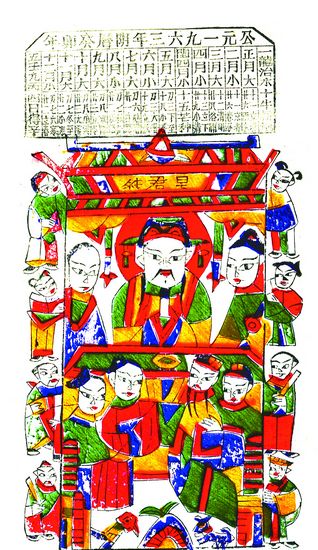 “灶王”又名“灶神”、“灶君”,是中国神话传说中司饮食之神。传说“灶王”于农历腊月二十四日至除夕上天陈报人间善恶,所以民间有在十二月廿三日(小年)晚祭祀“灶王”的习俗,除夕夜晚再行接“灶王”之礼。关于“灶王”的来历说法不一,其中北方流行“灶王”是玉帝女婿的传说。传说玉帝有个小女儿私下凡间,与一位小伙子结为夫妻,并为其夫君烧火煮饭。玉帝知道后,非常生气,就将夫妻俩封为“灶王爷”与“灶王奶奶”。后来,灶王奶奶看到百姓生活困苦,就经常借上天庭的机会偷偷带些吃的东西分给百姓,玉帝知道后,下旨只准女儿、女婿每年腊月二十三回天宫一趟。此后,民间就有了每年腊月二十三进行一次大扫除,晚上祭灶,送灶王爷、灶王奶奶回天宫,到了正月初一五更,再将他俩接回人间的民俗。
