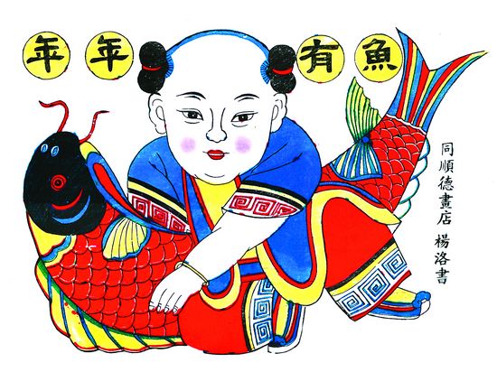 中国百姓每逢年节喜事,讲究良多,尤其注重讲吉利话,这在民间被称为“讨口彩”。在这类“讨口彩”的年画中,最有代表性的是“年年有余(鱼)”年画。在中国传统文化中,“鱼”和“余”谐音,所以鱼象征着富贵、富裕。在我国广为流传的年画和吉祥图中,经常有鱼出现。年画和吉祥图中的鱼大部分是鲤鱼或金鱼,因为“鲤”和“利”谐音,金则表示财富,所以它们就常和生意联系在一起,用来象征在生意中受益和赚钱。