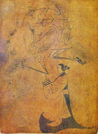 出土于湖南长沙陈家大山楚墓的“龙凤人物帛画”,就是一幅“龙凤配合图”。画面上的龙,竖身卷尾,头脸朝天,肢爪划动,跃跃欲上。旁边是与它相对应的凤凰——昂首展翅,飒然飞举。龙凤之下,站一位双手合掌、祈求升天的裙服女子。显然,龙和凤在这里是协同合作的关系,共同承担着导引人们脱离俗尘、升达天堂的重任。