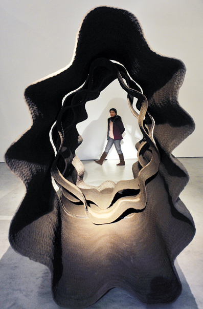 2月18日至3月18日,一场名为“周流·复歌”的陶艺展在台北举办。展出的32件作品,大致以“大单元”与“小单元”两种型态呈现。“大单元”的作品以单一或成双的群聚方式展现,有着类似海底植物或巨石阵的神秘特质,加上光影与空间虚实相映的对照,让现场氛围显现出具有剧场特质的诗性空间。而“小单元”聚合成如蜂窝、燕巢、牡蛎、珊瑚等的视觉景观。图为参观者在欣赏陶艺作品。 新华社发 吴景腾 摄