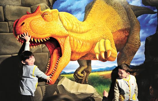3月2日,第二届日本3D艺术画展在台北科学教育馆开展。此次画展分为立体魔幻、森林探险、海底冒险等主题,共展出53件创意作品,让参观者体验一次趣味盎然的3D视觉之旅。图为画展上,两名小朋友与一幅3D立体画合影留念。 新华社发 吴景腾 摄
