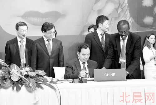 新闻出版总署署长、国家版权局局长柳斌杰在条约文本上签字(CHINE为法文的“中国”)。晨报记者 李木易/摄