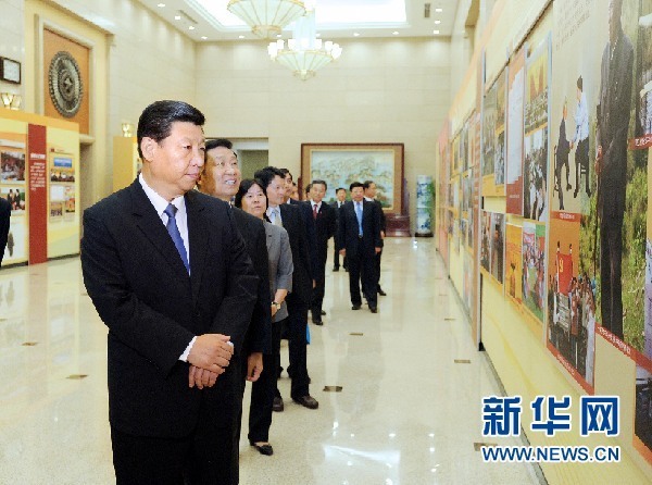 8月29日,中共中央政治局常委、中央书记处书记、国家副主席习近平在北京会见全国组织系统讲党性重品行作表率活动总结会议代表并讲话。这是会见与会代表前,习近平参观“为了党和人民满意——全国组织系统讲党性重品行作表率活动专题展”。 新华社记者 李涛 摄