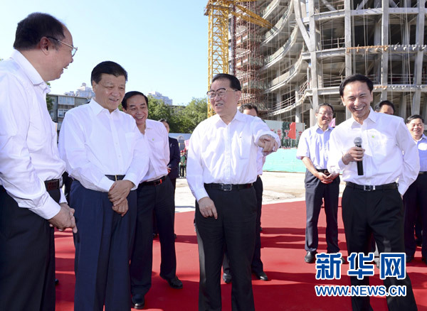 9月14日,中共中央政治局常委李长春在人民日报社调研。中共中央政治局委员、中央书记处书记、中宣部部长刘云山一同调研。这是李长春在人民日报社新媒体创业基地大楼建设工地考察。 新华社记者谢环驰