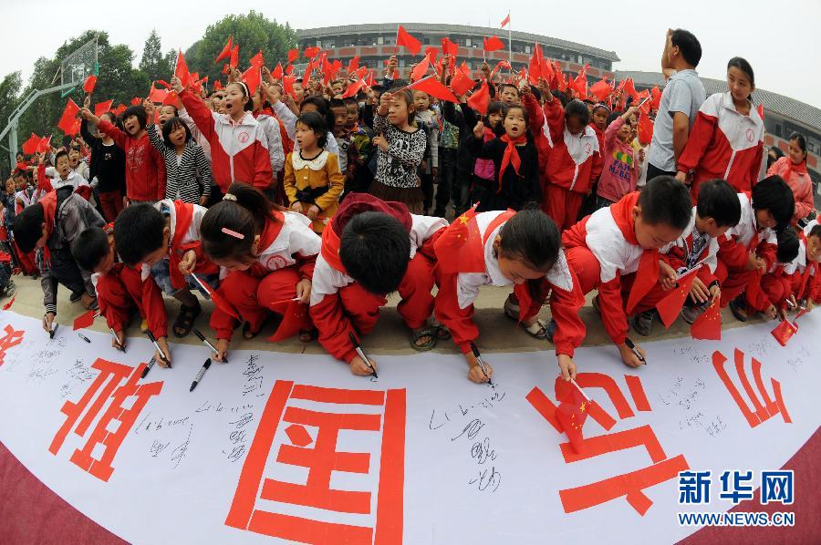 9月17日,山东省乳山市徐家学校学生在“勿忘国耻、爱我中华”的巨型宣传条幅上签名。当日,乳山市徐家学校邀请参加抗战的退伍老兵和驻地边防部队的现役军人走进学校,通过给学生讲解历史知识、宣誓等形式,开展主题为“勿忘国耻、爱我中华”的爱国主义教育活动。新华社发(刘国贤 摄)