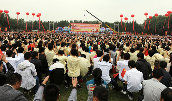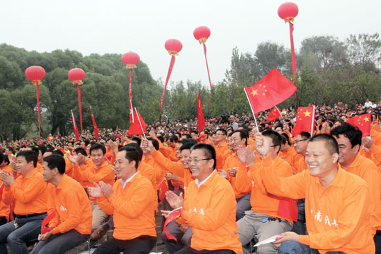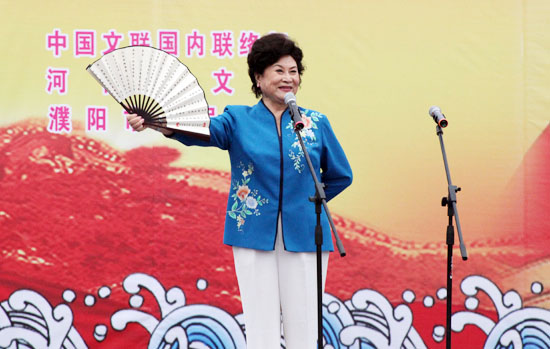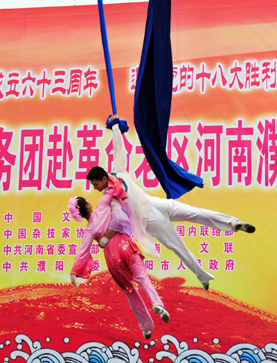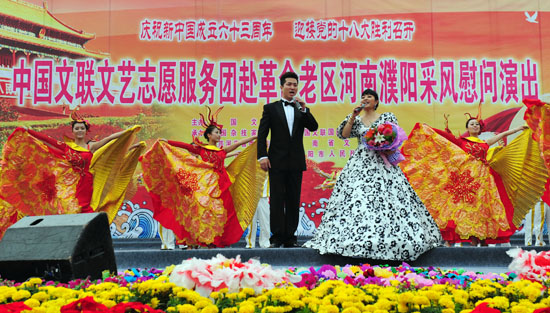 演出在濮阳市杂技艺术学校、濮阳市杂技团等表演的歌舞《龙腾神州》的喜庆旋律中拉开帷幕。姜昆与戴志诚合说的相声《欢歌笑语》,姜克美表演的京胡独奏《夜深沉》,中国杂技团有限公司带来的杂技《俏花旦——抖空竹》,刘兰芳演出的评书《张飞请孔明》,汪荃珍演唱的豫剧《抬花轿》选段,遂宁市杂技团演出的杂技《比翼——双人倒立技巧》,高保利演唱的《山丹丹开花红艳艳》,刘全和、刘全利带来的滑稽小品《兄弟拍电影》,焦健东、石磊表演的口技,济南市杂技团演出的《空中彩绸》,李彦培带来的《变脸》,殷秀梅演唱的《在希望的田野上》以及她与毋攀合唱的《走向复兴》等节目,在牛群、鞠萍幽默诙谐的主持串联下一一奉上。台上演员卖力地演出,台下观众们脸上洋溢着开心的笑容,这些观众来自濮阳的各行各业,有石油工人,有医护人员,有公安干警,有老师和学生,有农民、外来务工人员……而坐在观众席第一排身披红色绶带的老红军、优秀党员、道德模范和劳动模范,尤为抢眼。最后,演出在现场两万余人共同高歌《歌唱祖国》的壮观景象中落下帷幕。“看了今天的演出,我的心情可以用一句歌词来形容:咱老百姓今儿个真高兴!”濮阳市人民医院的小张护士脸上露出一个大大的笑容。