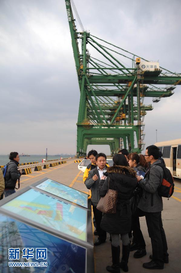 11月5日,几位记者在天津东疆保税港区采访。当日,来自境内外32家媒体的45位记者赴天津参观采访。十八大召开前,十八大新闻中心组织境内外媒体记者在北京及周边的河北、天津等地参观采访。新华社发(潘思危摄)