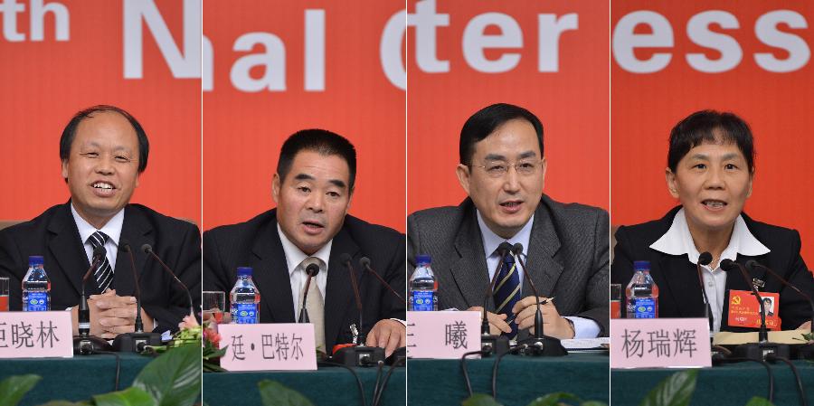 11月12日,十八大代表巨晓林、廷·巴特尔、王曦、杨瑞辉(从左至右)在集体采访活动上。