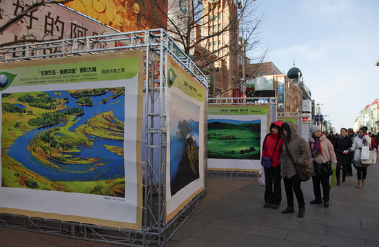 行人在王府井商业街观看“文明生态·美丽中国”影展。徐晓刚摄