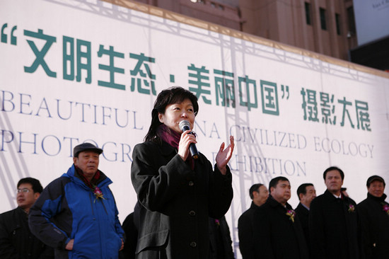 中国摄协分党组书记、副主席兼秘书长王瑶在“文明生态·美丽中国”摄影大展开幕式上讲话。吴承欢摄