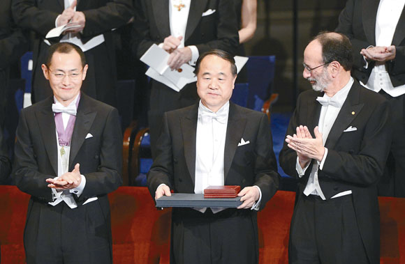 中国作家莫言(中)12月10日在瑞典首都斯德哥尔摩音乐厅获颁2012年诺贝尔文学奖。