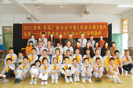 2011年5月,首届广西作家节在贺州市举行,图为作家们深入校园与小学生交流