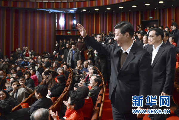 12月30日晚,2013年新年京剧晚会在北京国家大剧院举行。党和国家领导人习近平、李克强、张德江、俞正声、刘云山、王岐山、张高丽,与首都近千名群众一起观看演出,喜迎新年的到来。这是习近平向演员和观众招手致意。新华社记者 马占成 摄