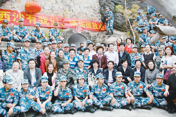 永兴村的演出在渔民们的欢呼、感谢、赞叹声中结束。几分钟后,赵实、李屹和文艺家们又来到永兴岛边的石岛。穿过长长的掩体,大家来到一处临海的哨卡。石岛是南海诸岛中最高的岛屿,四周都是巉岩峭壁。演出就在海礁的乱石丛中开始。几十个战士围坐在峭壁的海礁上,演员们在几平方米的空间里展开精彩表演。演员阵容堪比国家大剧院的顶级演出:著名男高音歌唱家刘维维一曲《打靶归来》引得全场合唱共鸣,刘兰芳、姜昆、戴志诚、关牧村一一表演。鞠萍与现场战士联袂合唱,朱磊的舞蹈使狭小的场地成为灵动的艺术空间,吴正丹、魏葆华在几乎不可能的环境里展示了他们震惊世界的《肩上芭蕾》,让现场战士们看得目瞪口呆,然后是把巴掌都拍红了的鼓掌。黄宏也为战士表演了单口相声。郁钧剑为大家演唱了自己为南疆儿女新创作的《南海谣》。歌声、笑声、掌声从岩缝里飞出来,四周是碧绿的浅水,远处是一片平静的深蓝。波涛亘古的大海仿佛都被这千万年从未出现过的天簌之音惊得顿失涛涛。姜昆的话说出了全体文艺家的心声:“今天这个舞台可能是世界上最独特、最狭小的舞台了,但这个最小的舞台却有全世界最大的背景。这个背景不仅是我们身边的浩瀚南海,更有一个强大的祖国在我们的身后。”