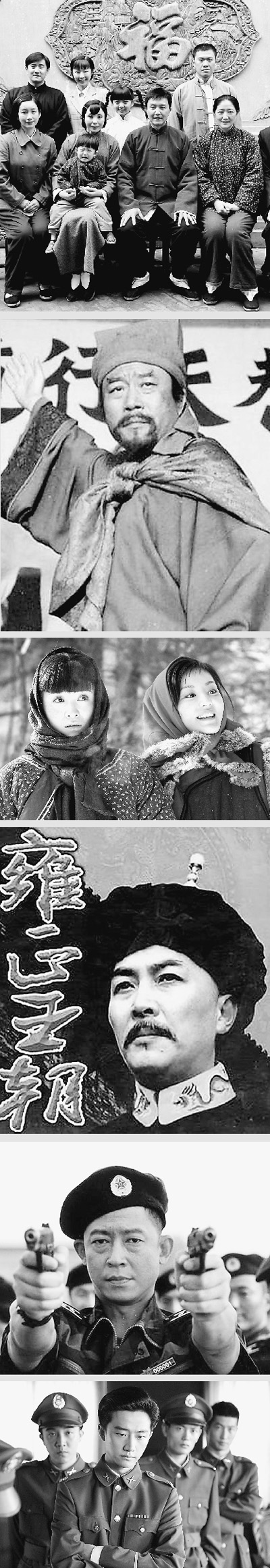 图为央视“一套”近年来播出的部分“开年大戏”剧照,从上至下依次为:《全家福》、《水浒传》、《闯关东》、《雍正王朝》、《DA师》、《黎明前的暗战》。