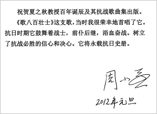 夏之秋很快就在武昌和汉口组织起两支抗敌工作团歌咏队,到学校、工厂、街头去宣传抗日,用歌声来唤起民众。在这火热斗争的激励下,他拿起笔谱写抗日的战歌。