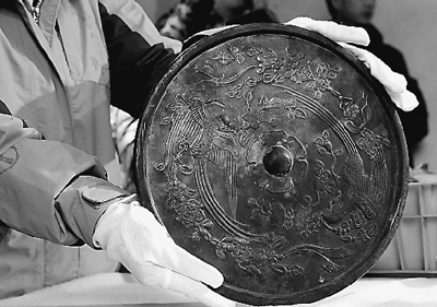 考古工作人员展示出土的唐代“鹦鹉衔绶带铜镜”。 新华社记者 任 珑摄