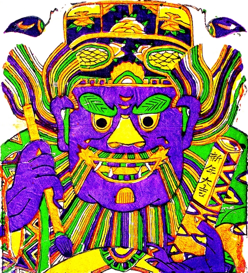 这幅钟馗像只表现面部,给人以深刻印象。画中钟馗绿眉血口,紫面獠牙,右手握笔,左手持“新年大吉”的卷轴,形象似用“特写”手法,极具冲击力,黄紫对比,强烈夺目。民间在过年时,贴此像于门楼或影壁墙上,以辟邪纳福。