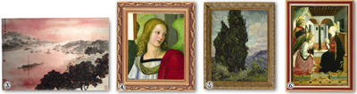 推荐作品:《读书仕女》林风眠、《花果》潘玉良、《老重庆》吴冠中、《黄山人字瀑》刘海粟、《华盛顿》周铁海、《三毛从军记》张乐平