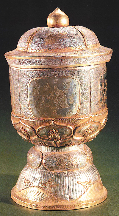 陕西扶风法门寺唐塔地宫出土的金花银香宝子。