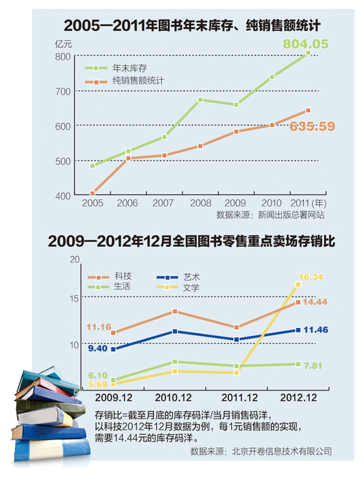 繁荣的景象之下,却是日渐沉重的库存负荷。全国新华书店系统、出版社自办发行单位纯销售额从2005年的403.95亿元增长到了2011年的653.59亿元,而年末库存则从482.92亿元飞涨到804.05亿元。6年时间,两者的剪刀差从近79亿元增长至150亿元——库存跑赢了销售,更多图书只能在仓库中蒙尘。
