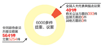 全国人大代表共提出议案401件,其中有关立法方面的393件,监督方面的5件,其他方面的3件。反腐败法的建立、劳动教养制度改革、环境保护法修正等,针对民众呼声极高的立法改革,均给出了详细的建议。