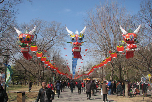 4月6日,在北京陶然亭公园内东门主干道上空悬挂的3条身长达120米的巨龙风筝并排飞舞,中间龙身图案是56个民族,两侧龙身是京剧脸谱,道路两侧一个个造型别致的风筝造景夺人眼球。当日,以“与风共舞,沁游陶然”为主题的第二届风筝春花文化节在该园举行,1300余只造型各异的风筝在此展出。