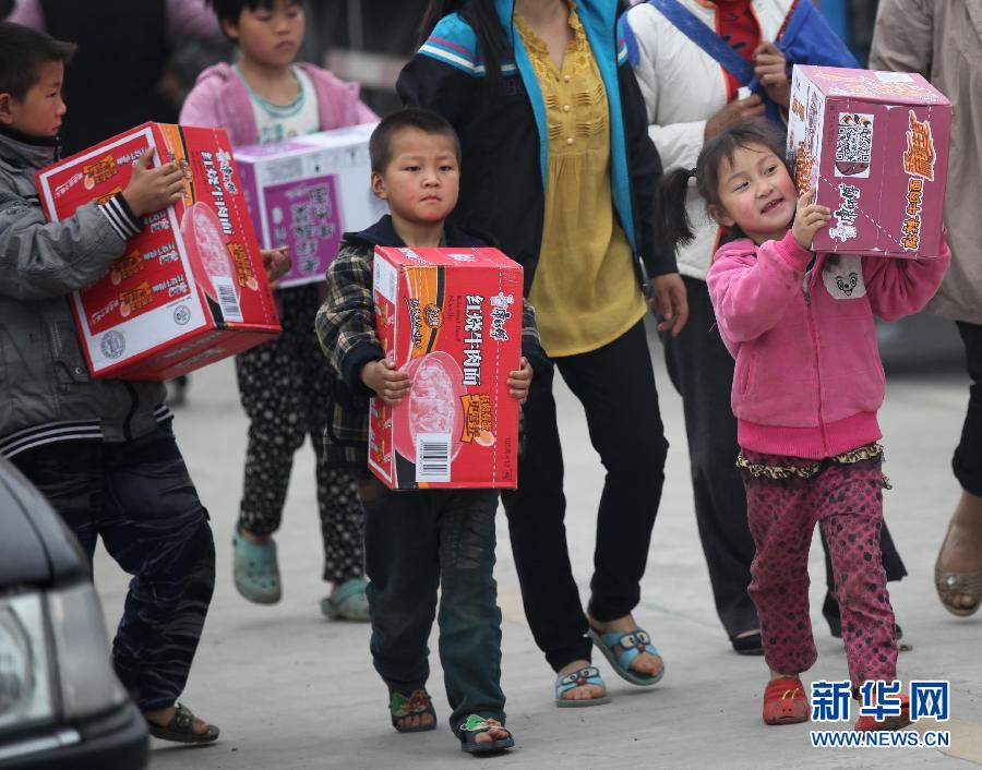 4月22日,在四川省芦山县龙门乡安置点,小朋友在领取救灾物资。当日是四川省芦山“4·20”7.0级强烈地震发生后的第三天,抗震救灾工作已经逐步由抢险救援转向物资发放和群众安置。目前,社会各界捐赠灾区的各种物资正有序发放到灾民手中。新华社发(张晓理 摄)