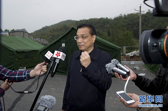 图/文 黄敬文/陈二厚 2013年4月20日上午8时02分,四川省芦山县发生7.0级地震。中共中央政治局常委、国务院总理李克强迅速作出抗震救灾的重要指示,国务院根据国家抗震救灾应急预案启动抗震救灾一级响应,紧张有序地开展救灾行动。中午1时10分,李克强率有关部门负责人和相关专家飞赴灾区。从这一刻起到21日中午1时30分回京,李克强在飞机上召开紧急会议、搭乘运输直升机抵达震中、来到医院看望受伤群众、冒着余震攀上废墟了解救援进展、走近受灾群众倾听愿望心声、现场布置对中断联系的宝兴县进行救援、打着手电开会研究灾情形势部署救灾工作、深夜查访电力供应恢复情况、走进帐篷探访受灾群众安置、看望地震危重伤员部署救治工作。24个小时里,地震灾区留下他繁忙的身影和马不停蹄的足迹。 4月21日清晨,李克强在芦山县临时休息的帐篷前接受记者采访,他声音沙哑,但语气坚定地说,现在正是救灾的关键时候,争分夺秒至关重要,多救活一个人,就是胜利。新华社记者 黄敬文 摄
