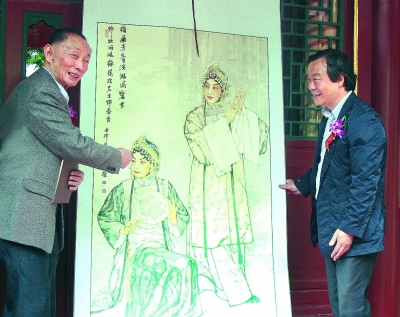 日前,著名京剧表演艺术家、京剧大师梅兰芳之子梅葆玖先生获聘担任梅兰芳纪念馆荣誉馆长。他动情地说:“我当年跟父亲、母亲在这个院子里生活,在这个院子里排戏、吊嗓子、练武功。如今,一个甲子都过去了,我现在都快八十岁了,我又站在这个院子里,往事历历在目。我能做的就是把我所会的艺术传承给大家,为梅派艺术、为弘扬中华民族的传统文化和京剧流派艺术,尽我应尽的责任。”图为梅葆玖在聘任仪式上与画家韩学中一起欣赏韩学中根据梅兰芳、梅葆玖同台演出京剧《游园惊梦》情景创作的国画作品。