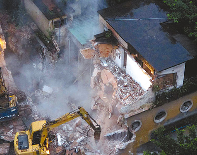 两辆挖掘机在拆除两幢民国建筑。 黎旭阳摄(人民视觉)