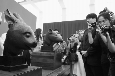 与会记者和嘉宾在捐赠仪式现场观赏和拍摄兔首(左)和鼠首。新华社记者 李鑫摄