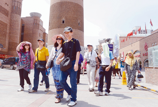 作为东西方文化的汇集点,乌鲁木齐市正着力打造以7坊街文化产业园和新疆国际大巴扎为代表的文化景点,力求将新疆现代艺术和浓郁西域民族特色完美地展现出来,以文化聚人气,以文化促沟通。图为近日几名来自台湾的游客正在新疆国际大巴扎游览观光。新华社记者王菲 摄