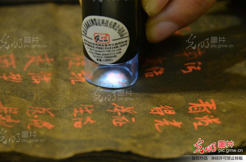 7月27日,通过文物鉴定专用放大镜欣赏疑似“渤海文”原件作品。