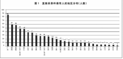 目前采录到的吟诵传人在全国的分布情况如图1所示,以广州和湖南最多,华东地区包括山东、江浙一带、安徽、江西、上海、福建等地约能占到全国吟诵传人总数的四分之一以上。华北、华中和西南地区次之,广西省及港台地区、西北和东北地区较少。总体来说,南方多于北方,东部多于西部,农村多于城市。前两点是由于教育发展程度不均衡所致。而农村多于城市则是因为大城市现代化较早、私塾消亡得快,相反在很多小城镇和农村,私塾传统延续得长一些。但小城镇和农村的传人传诵的质量总体略低于大城市的传人。
