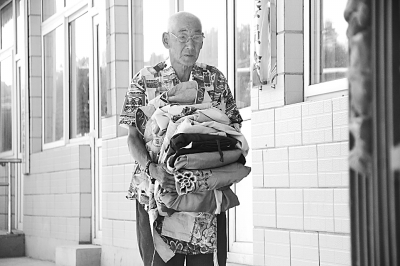 81岁的刘显臣老人抱着戏服准备晾晒。(资料图片)