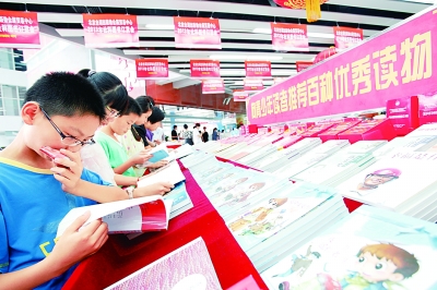 右图为在订货会展厅中心位置,主办方集中展示了50余种“中国梦”主题图书和中宣部、教育部、共青团中央向青少年推荐的100种优秀图书和100部优秀影视片。(李苑摄)