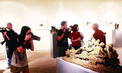 8月8日,雕塑家、画家李小超《远去的村庄》系列雕塑、绘画展在北京保利艺术馆开幕。出生于陕西省礼泉县的李小超,长期生活在黄土高原,多年来致力于中国式雕塑、美术的研究和创作,创作了《一个村庄的记忆》等系列作品,客观记录了当下中国农村的真实状况。图为观众在欣赏他的作品《拖拉机》。 刘新武摄