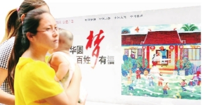 江苏省扬州市,市民正从“中国梦”公益广告宣传画前走过。CFP