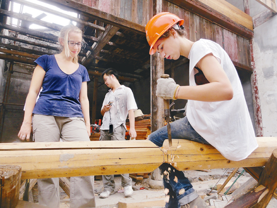 8月21日,一名法国志愿者在使用苏州木匠的传统工具给木条开槽。当日,来自中法两国的志愿者在江苏苏州平江路历史街区,一同参与古建筑的修复工作。这些志愿者来自第三届中法文化遗产保护志愿者工作营,由9名法国志愿者和9名中国志愿者组成。他们在平江路上共同学习苏州传统建筑工艺,一起参与平江路传统建筑的修复工作,亲身体验传统建筑工艺的魅力。新华社发 王建康 摄