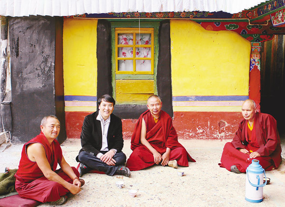 叶小纲20多年来一直坚持西藏题材音乐创作,图为他在西藏萨迦寺与喇嘛席地交流