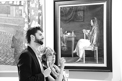 “悦色青黄——快速转换中的个性”中国当代百名优秀中青年艺术家赴欧美艺术联展9月2日在伦敦摩尔画廊开幕。展览推出中国当代100多位优秀中青年艺术家的300多幅画作,9月在英国伦敦和美国纽约先后展出。图为画展开幕酒会上来宾观赏展出作品。