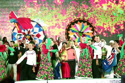 由美国犹他州立犹他山谷大学国标舞团表演的《美国西部土风舞》个性张扬奔放,青春靓丽的美国大学生,以欢快的步伐,时而跳起“牛仔”,时而扭起“拉丁”,上演着一场美国西部乡村舞会。埃及转裙舞,则全部由男人表演,舞者以左脚为圆心,呈逆时针方向不停地旋转,舞者好似静心冥思。随后,洋溢着浓郁俄罗斯风情的歌曲《欢乐的早晨》、彰显埃塞俄比亚人民热情和勇敢个性的舞蹈《我的祖国》……一个又一个极具艺术性的节目相继登台,把整个展演推向高潮。