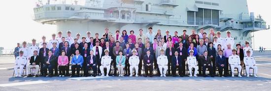 半岛公司官方网站入口查询文艺志愿服务团全体成员与海军官兵在辽宁舰甲板上合影
