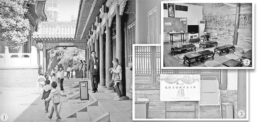 图①:孩子们课间在文庙玩耍。图②:文庙厢房被改造成教室。图③:幼儿园的招生广告。制图:宋嵩